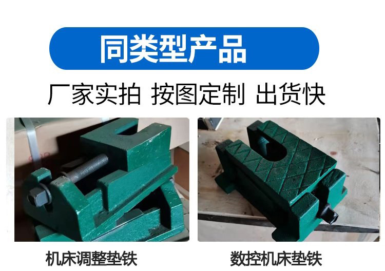 將調(diào)整墊鐵分別放在機床各受力點下,每個墊鐵均受力后,然后調(diào)整墊鐵??烧{(diào)整高度為3mm--15mm 鑄鐵調(diào)整墊鐵調(diào)整方便,遷移靈活,不用打洞埋設(shè)地腳螺絲,不破壞地面,是機床設(shè)備安裝工藝的一大改革。能_同床動態(tài)特性,提高機床加工精度,具有防震、降低噪音之功能。省工、省時、省材料、綜合經(jīng)濟益高。為設(shè)計部門解決了因設(shè)備選型困難,造成地面基礎(chǔ)無法確定的矛盾。通用性廣,適用安裝各類機床與設(shè)備。